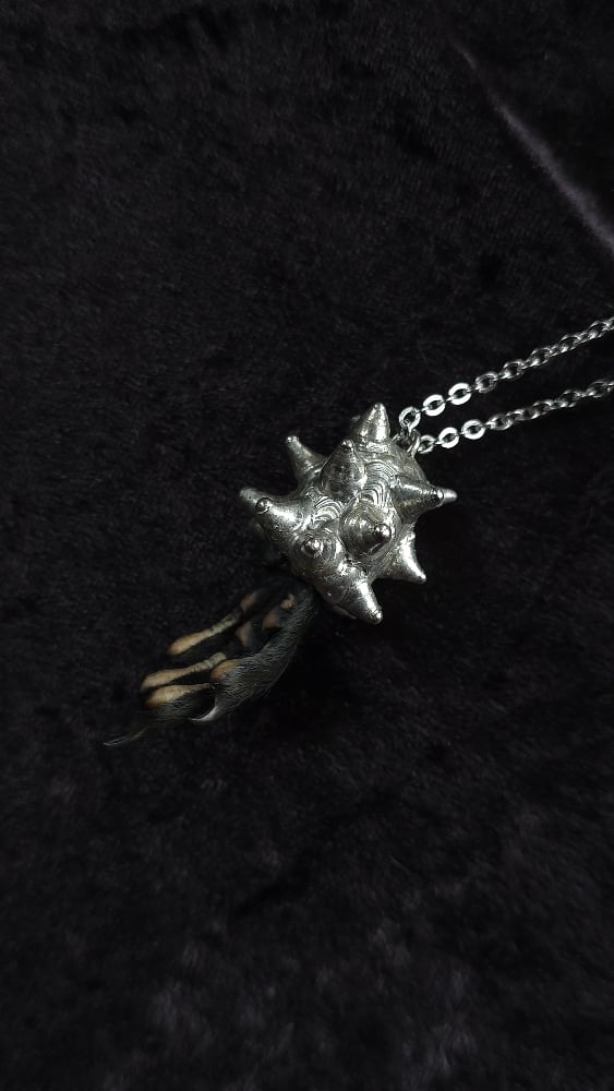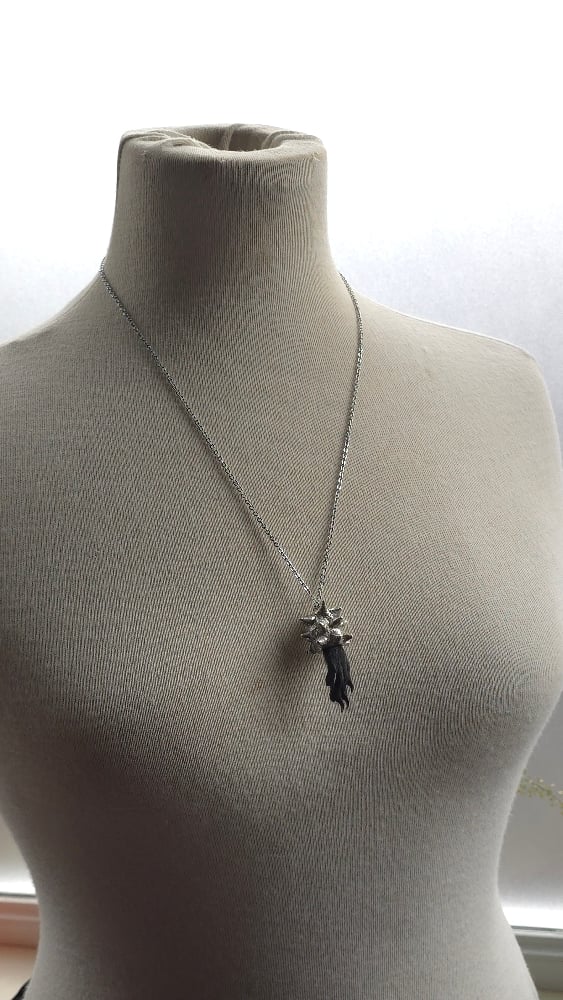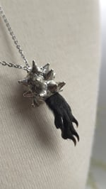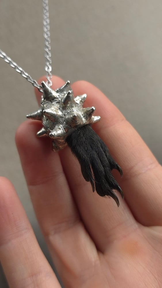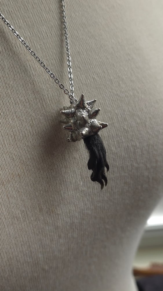 Squirrel paw dyed black . Silver spikey solder (lead free) . Steel chain measures 24" as seen on mannequin.