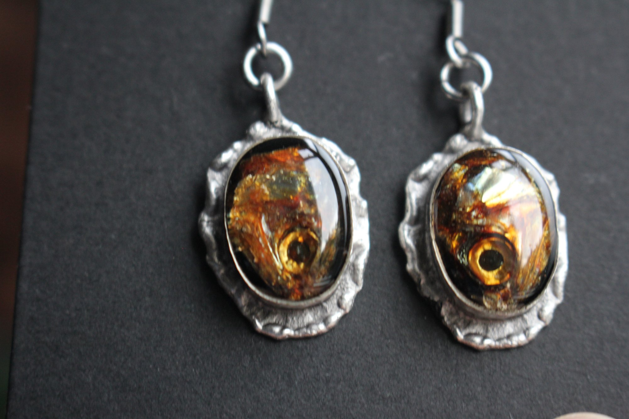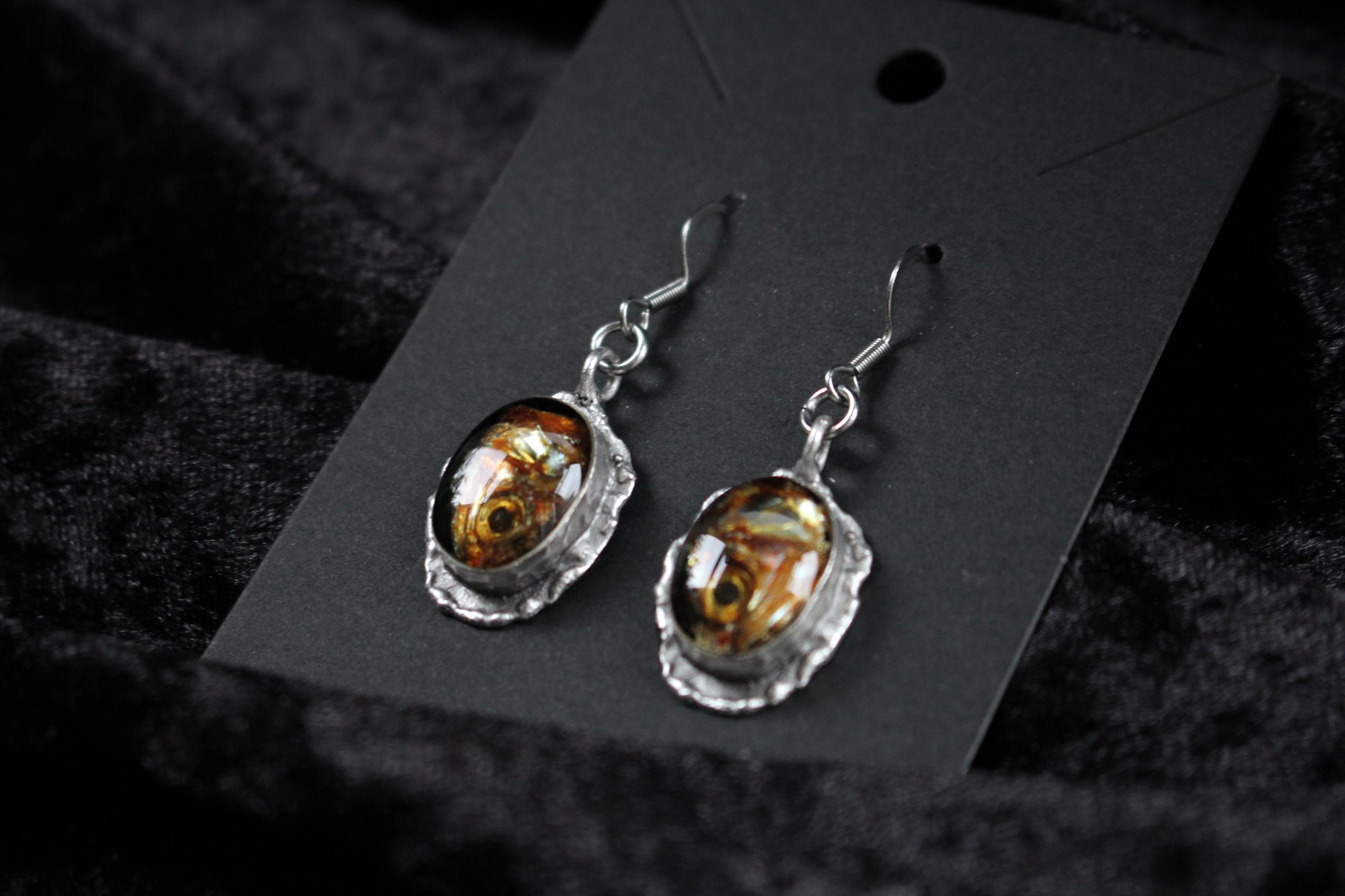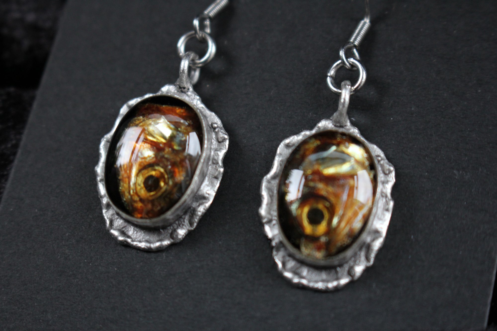Real tiny fish heads inside eco friendly resin set onto silver plated bezels, on stainless steel hooks.