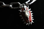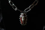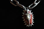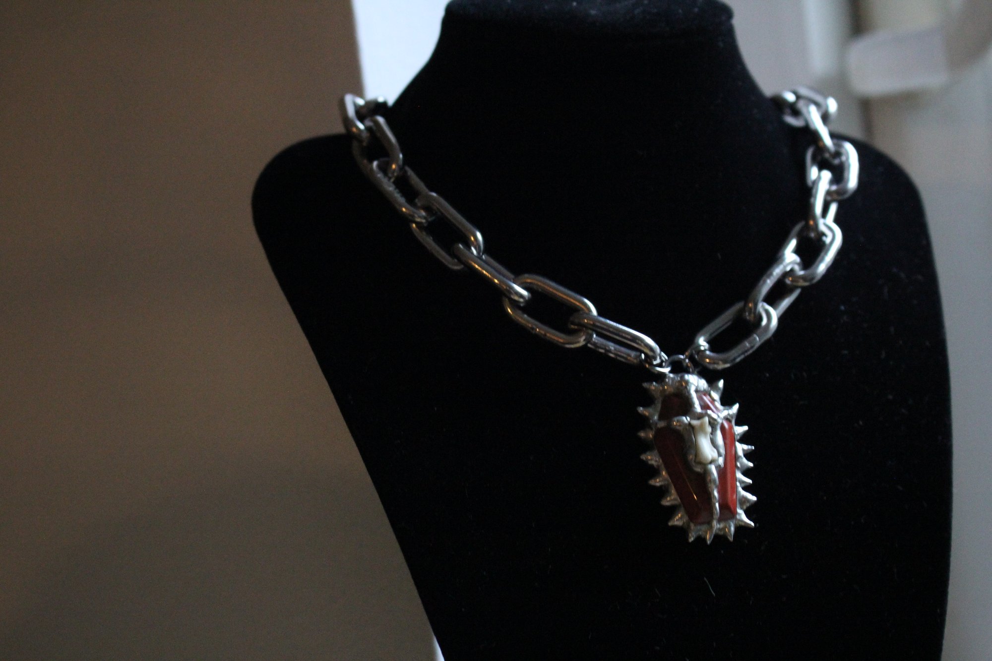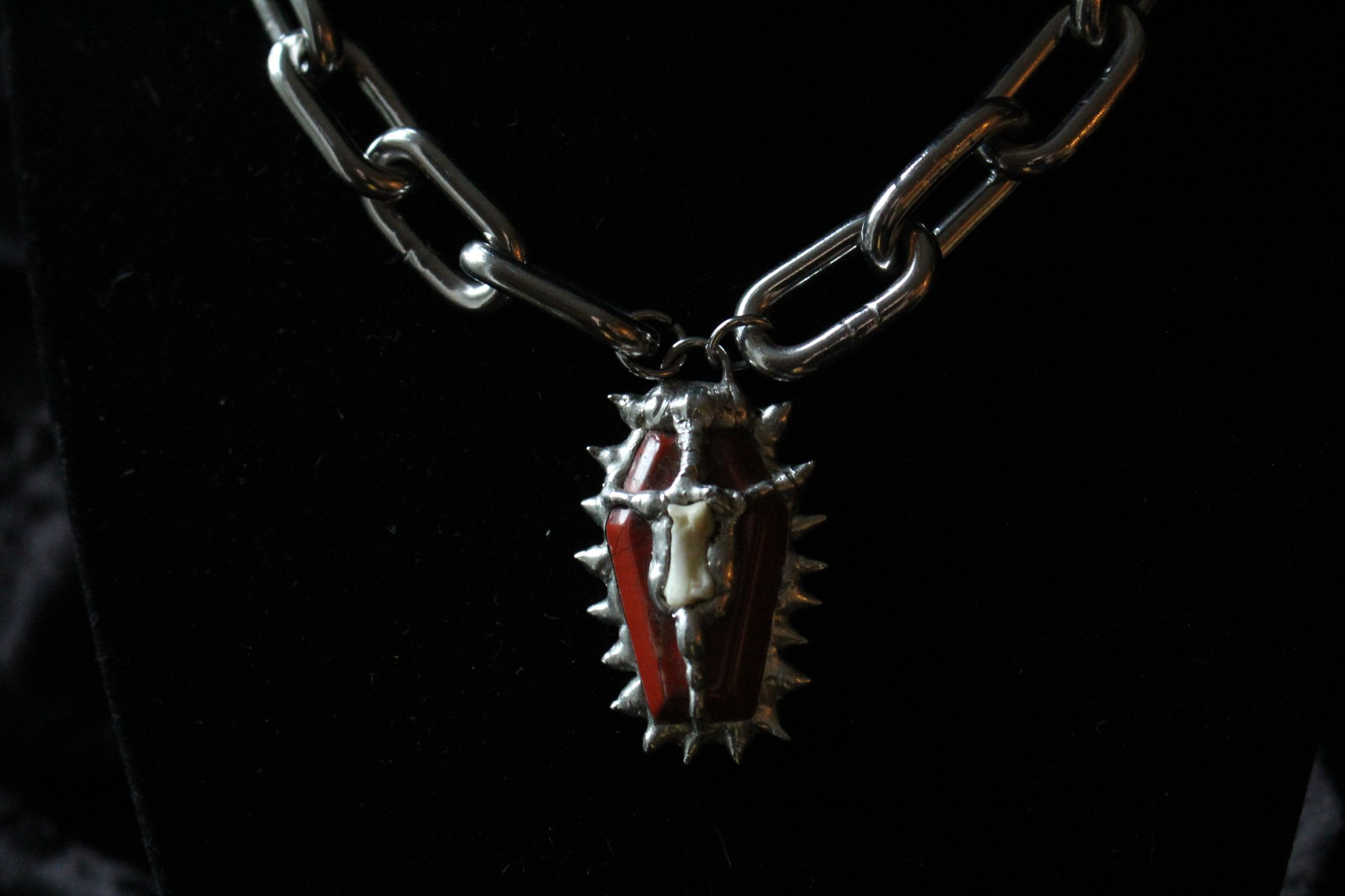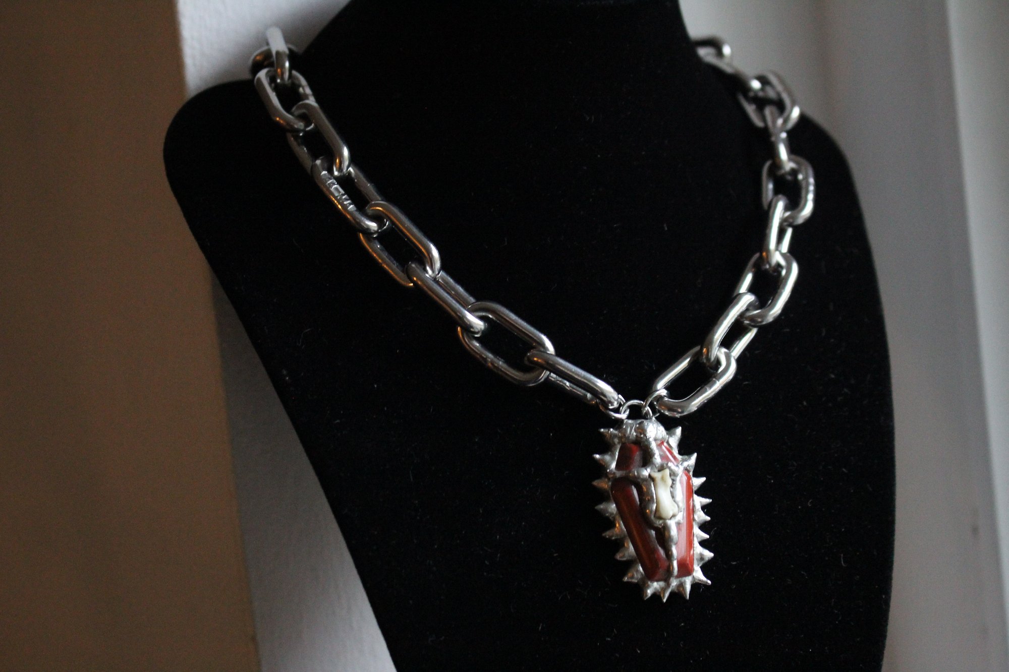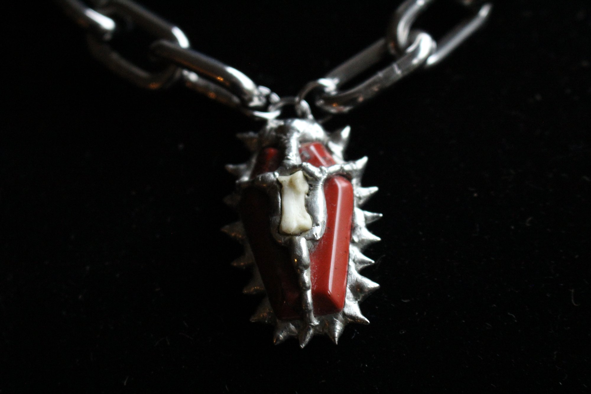 This unusual necklace is made from a coffin shaped piece of red jasper and a fox toe bone in the middle. It has been soldered with spikes to give it a unique look and comes supplied on a chunky 16'' steel chain.