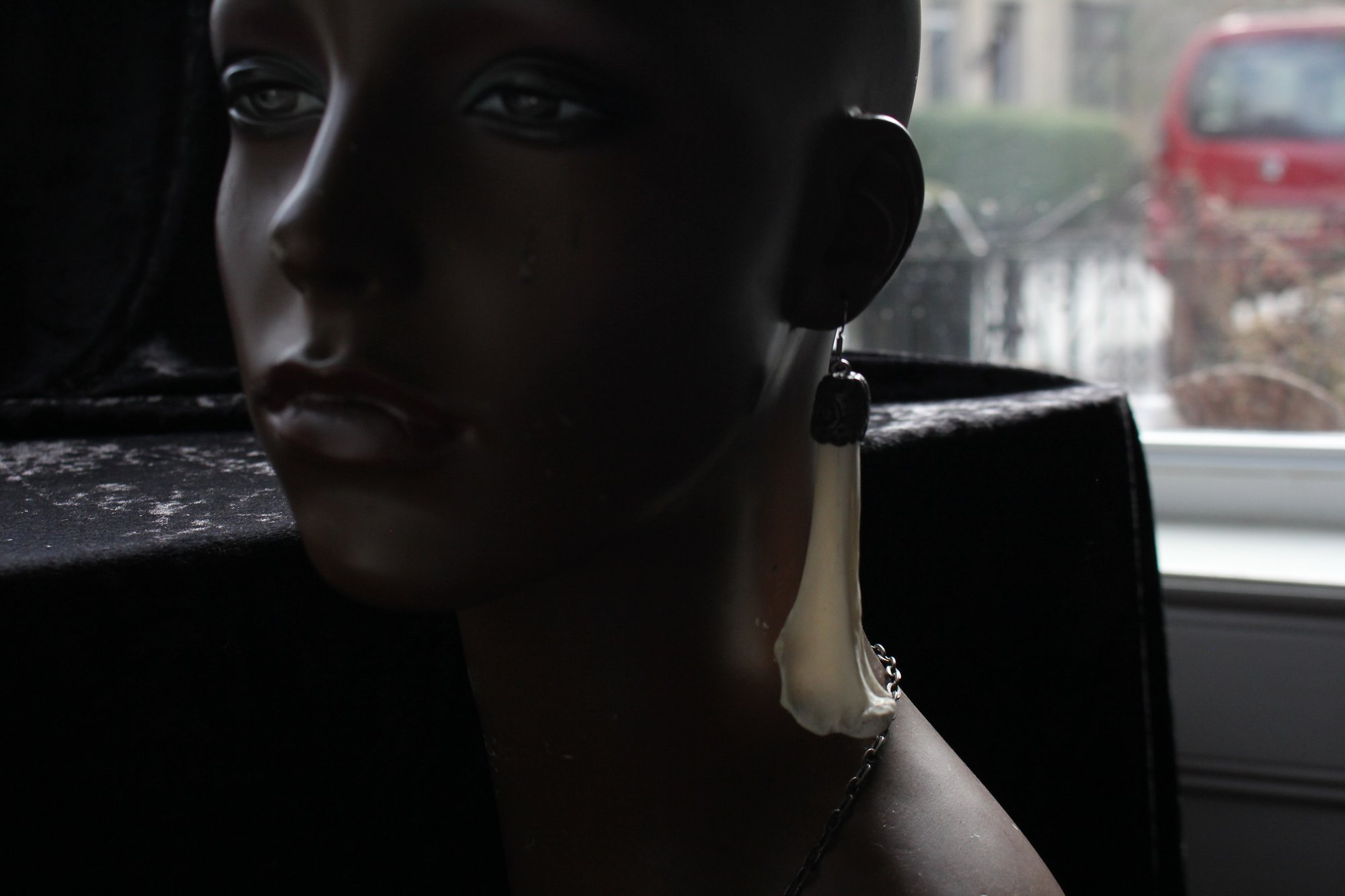 These fox bones where foraged by myself in the wilds of Salford. I was alerted to the whereabouts of a deceased and rotted carcass and took the bones home to process on my allotment. I cleaned them up nicely and added whimsical clay patterns and stainless steel earring hooks.
