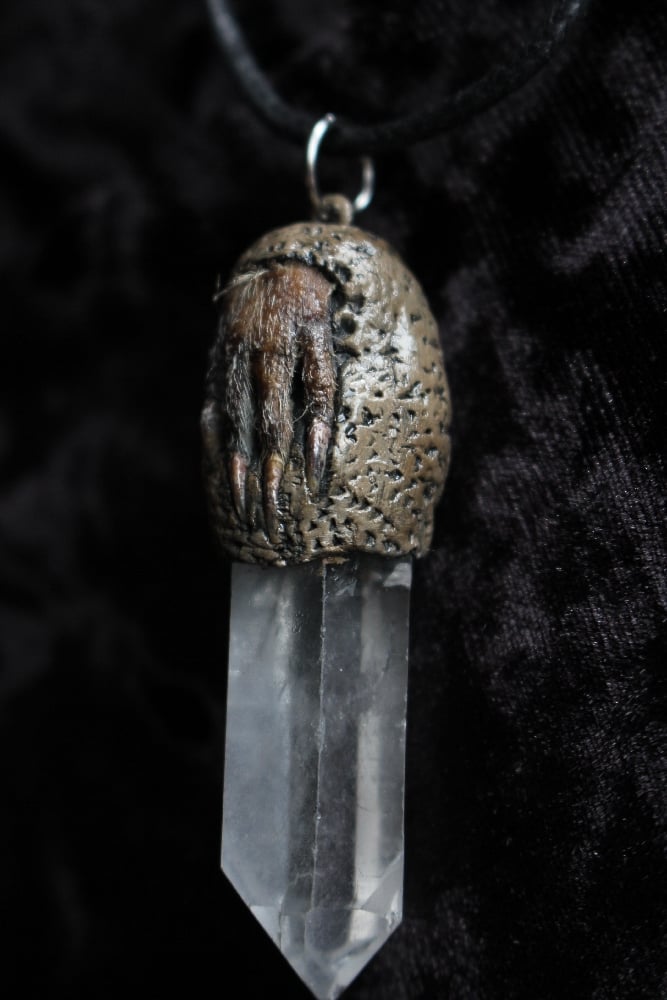 This guinea pig paw was taxidermied and dried by myself from a guinea pig that died of natural causes and was donated to me . it is set in a hand sculpted pendant including a real shard of quartz crystal.