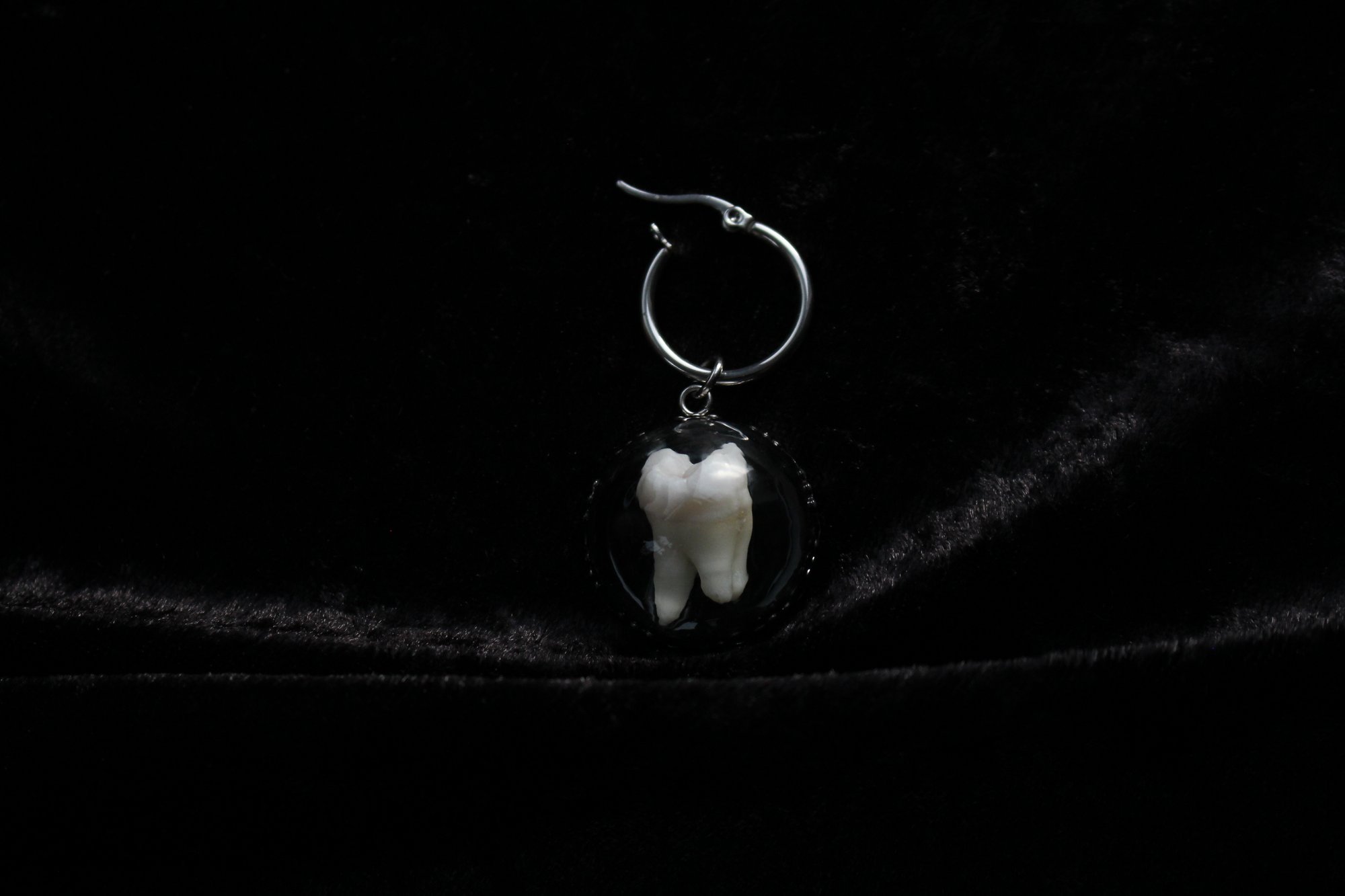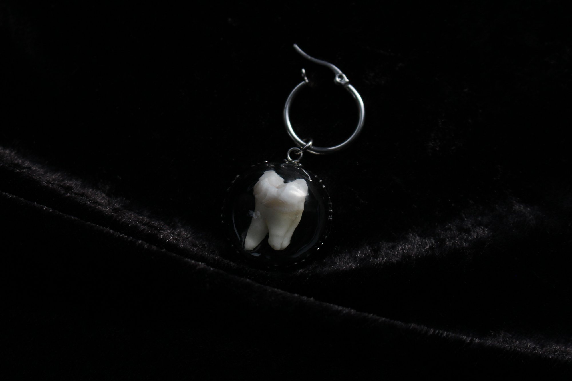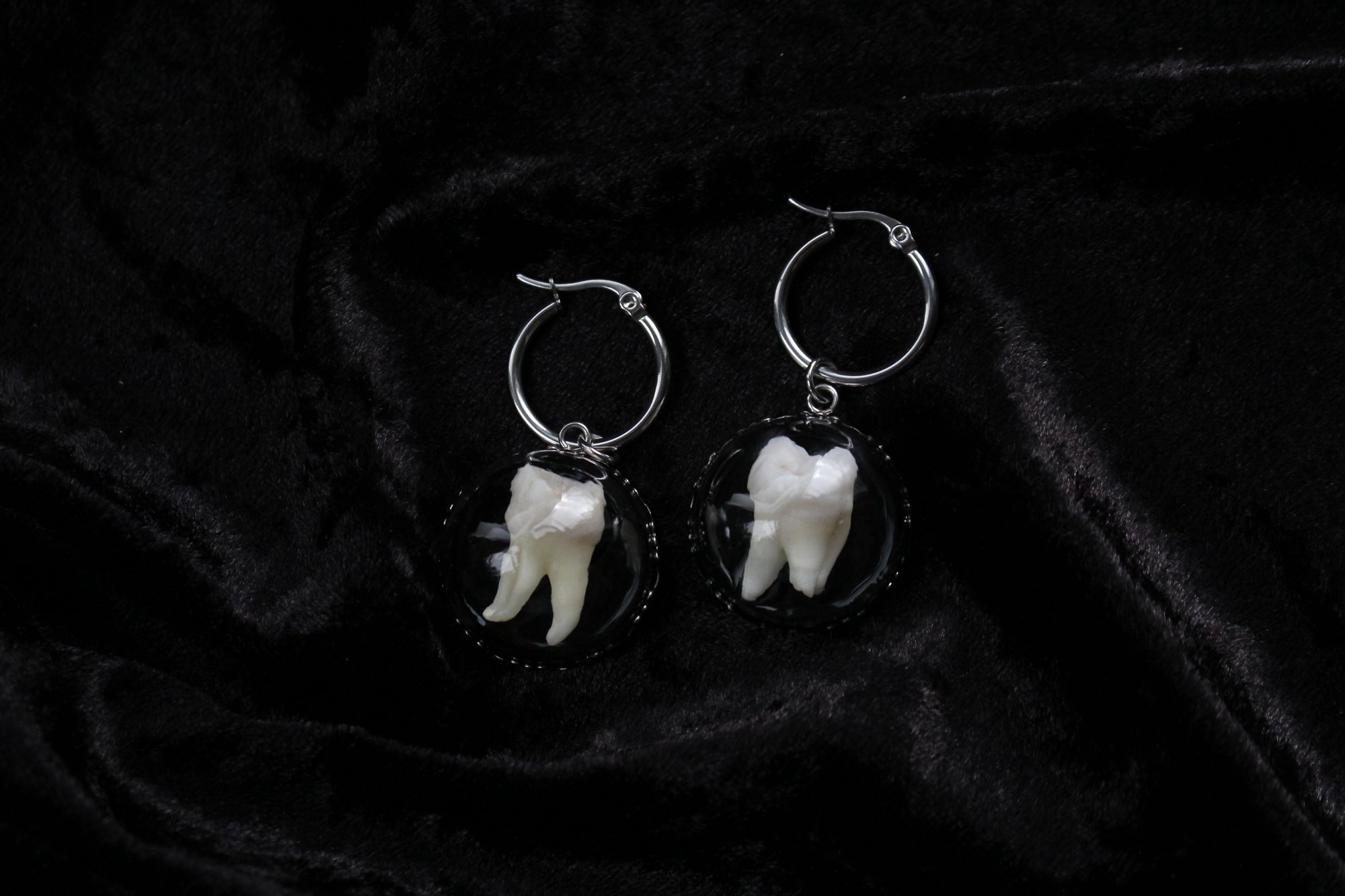 Real human teeth under glass domes set onto stainless steel with steel hoops. Hoops can easily be taken off and the earrings made into 2 pendants .