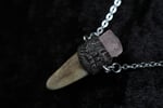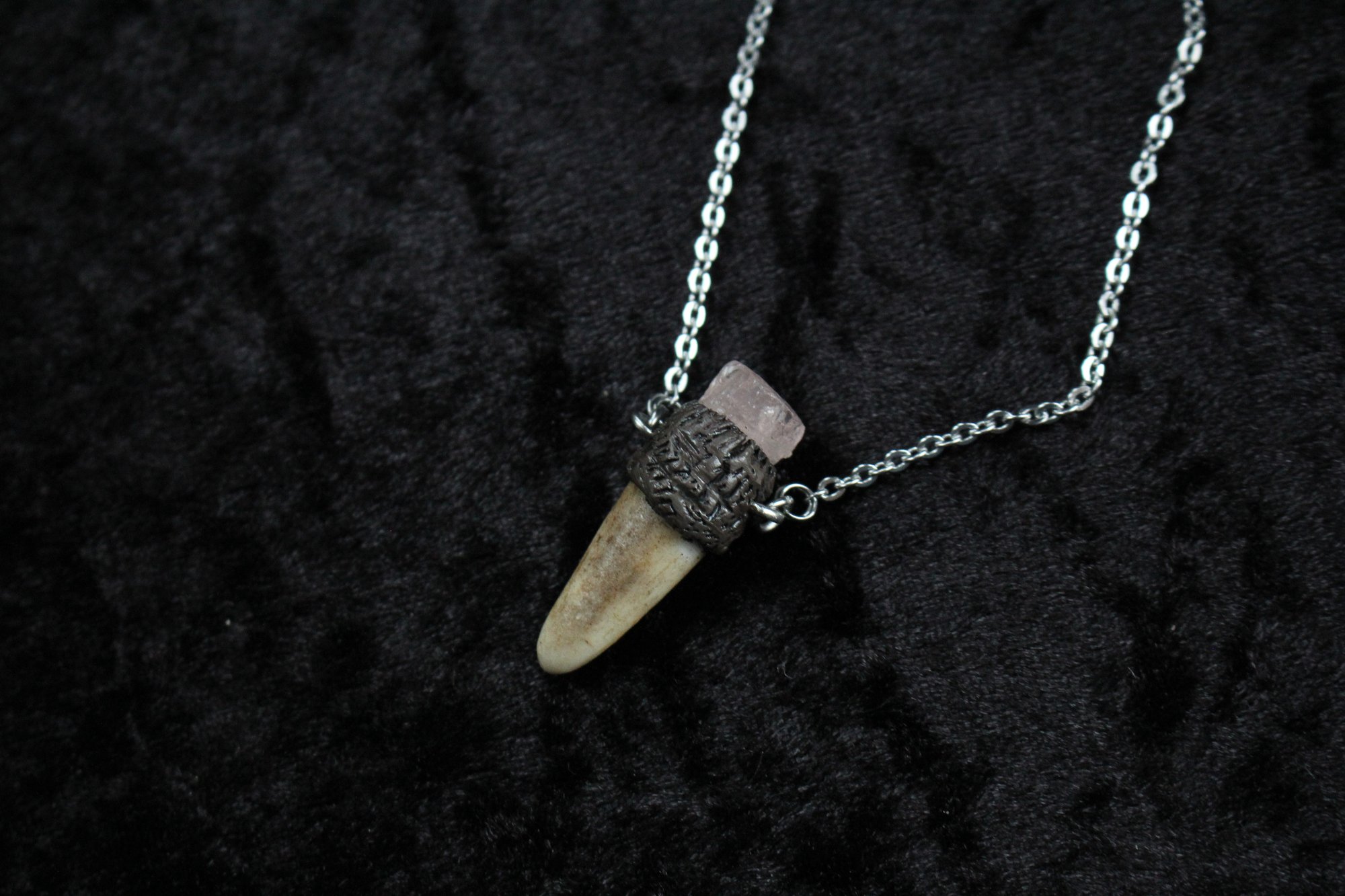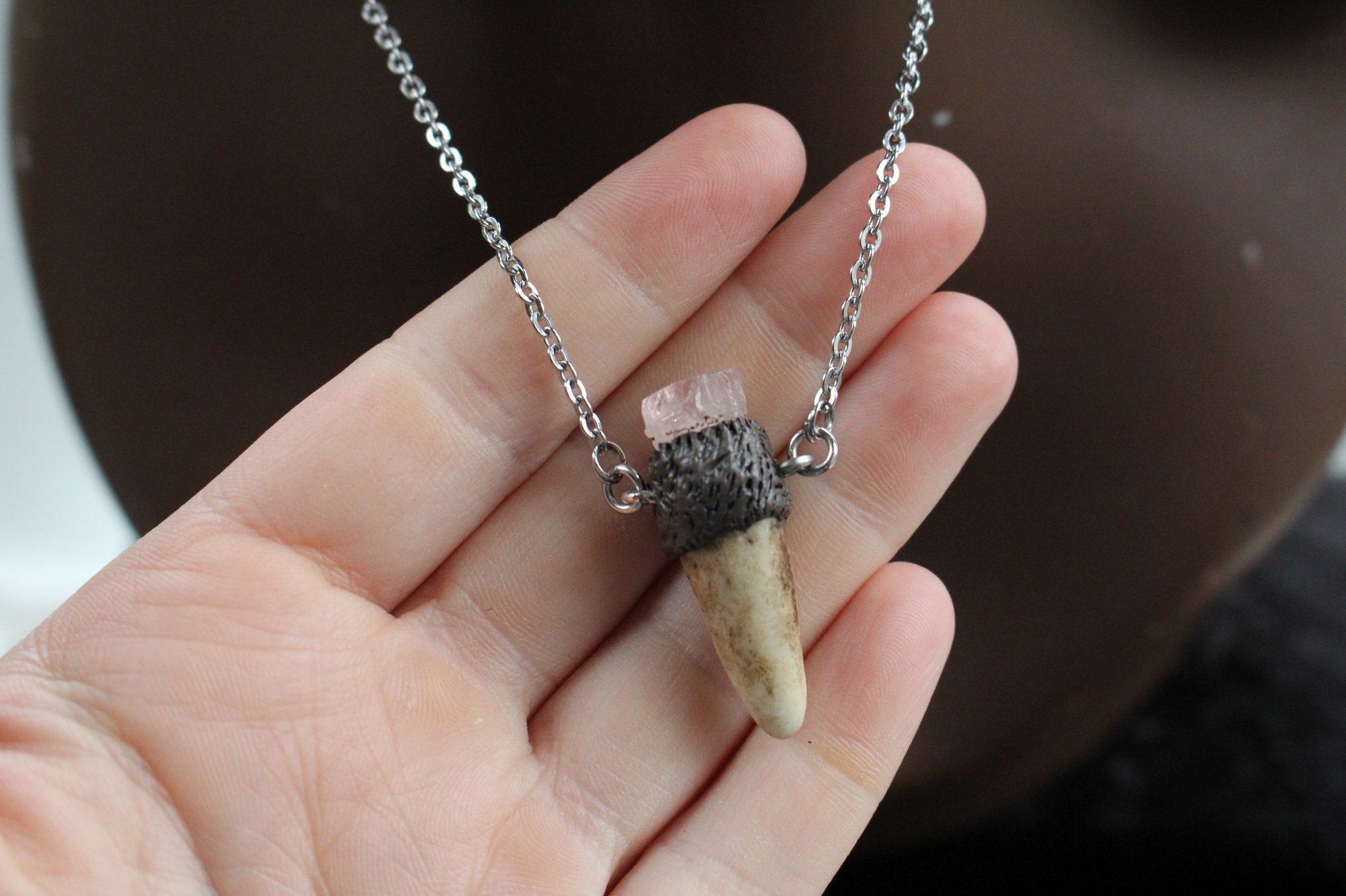This beautiful necklace is made from a naturally shedded deer antler , cut at the tip with clay and a rose quartz crystal accent.