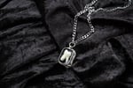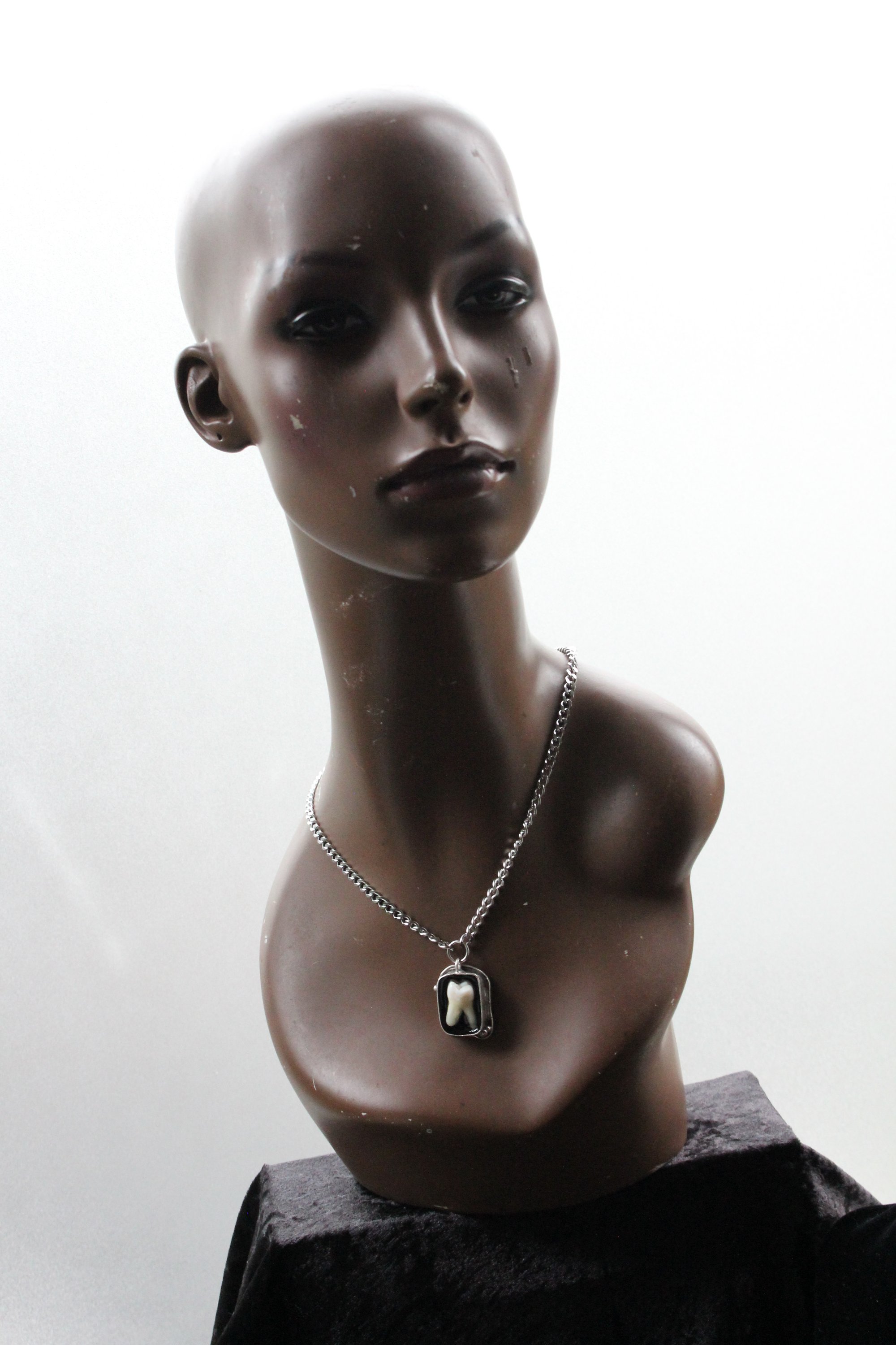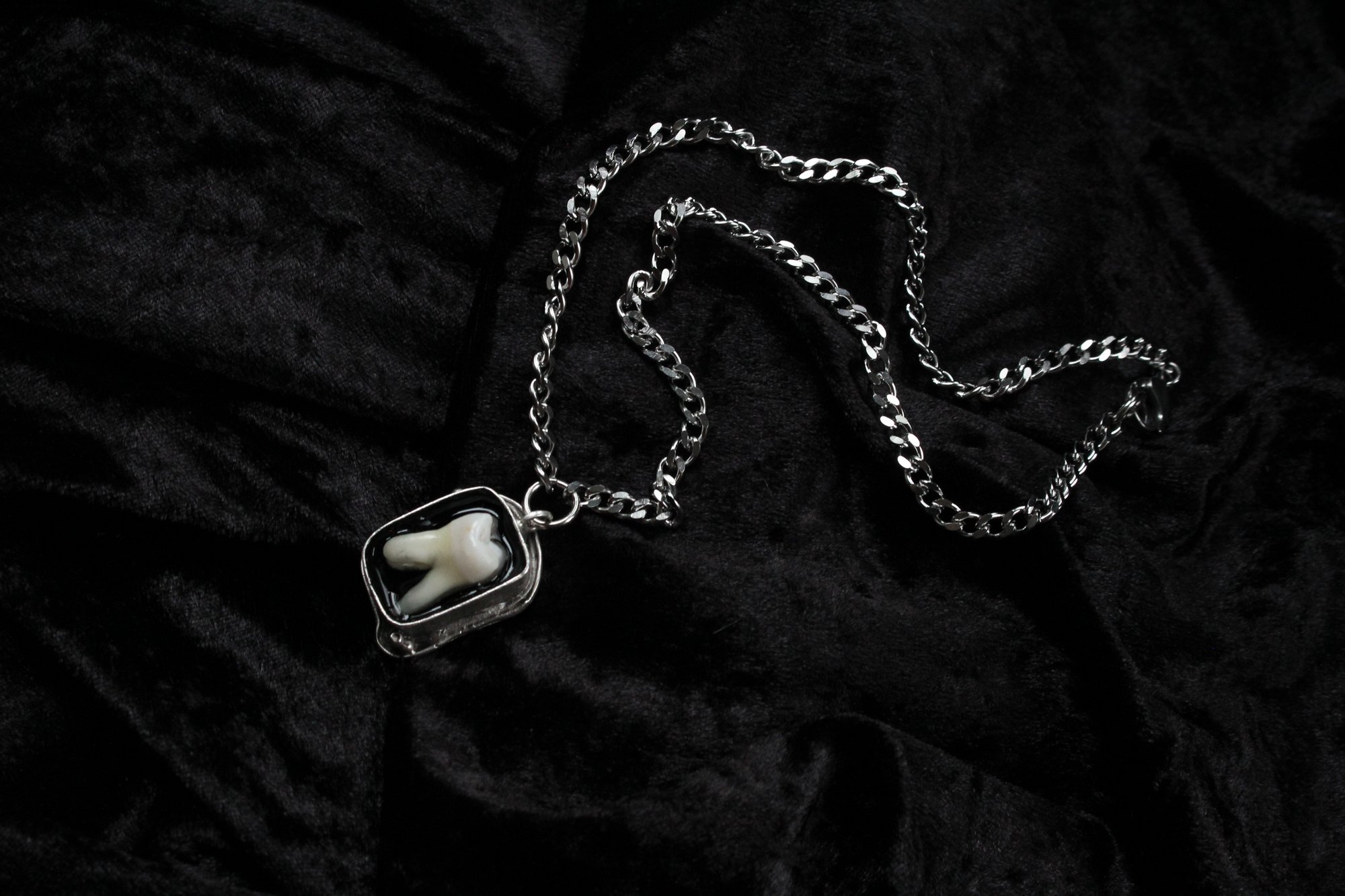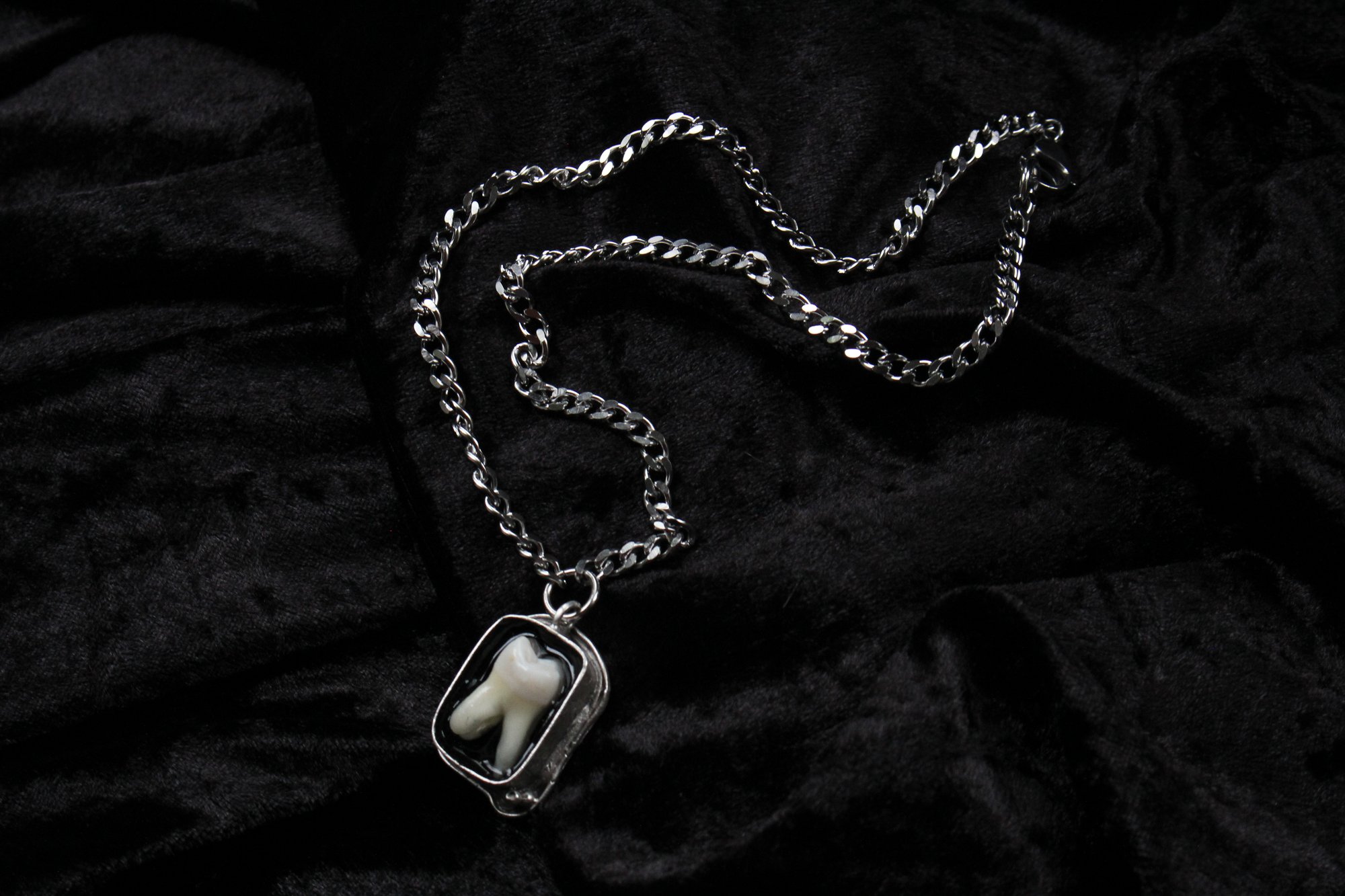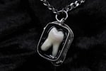 This ethically sourced donated human molar is set in eco friendly resin against a silver plated brass setting, on a steel thick 18'' chain