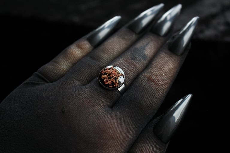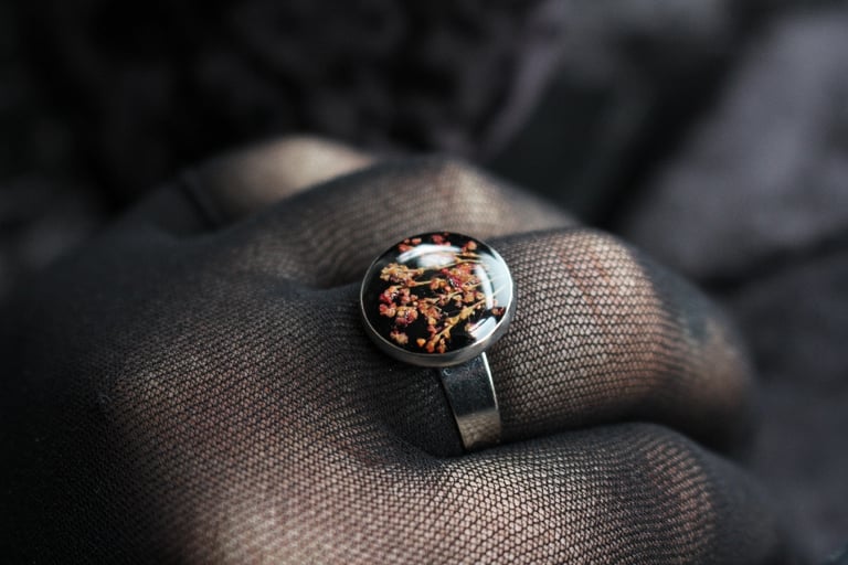 this cute little ring is made with stainless steel and non toxic resin. it's adjustable and contains a sprig of sorrel seed picked on my allotment.
