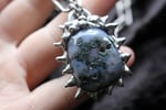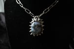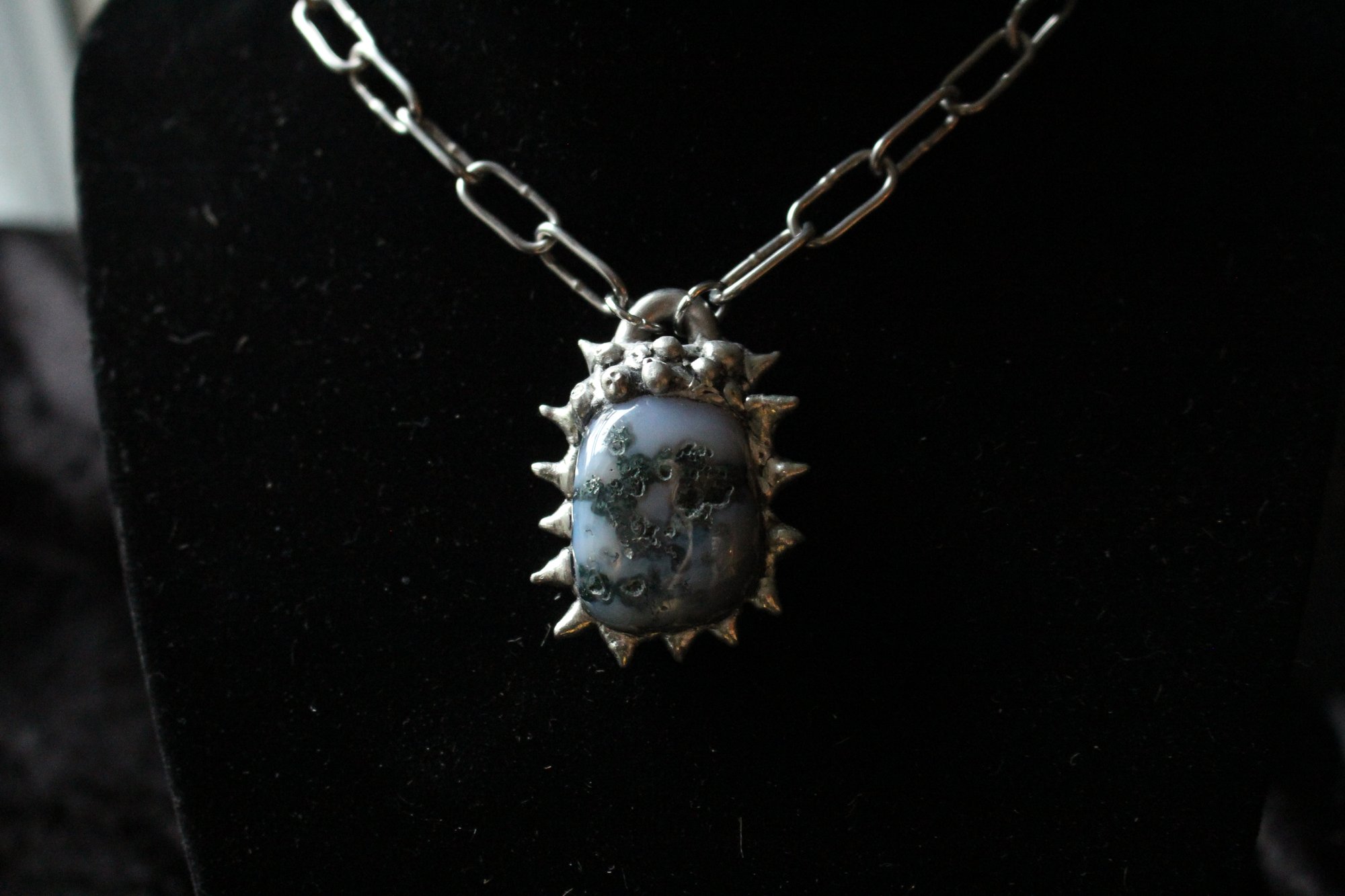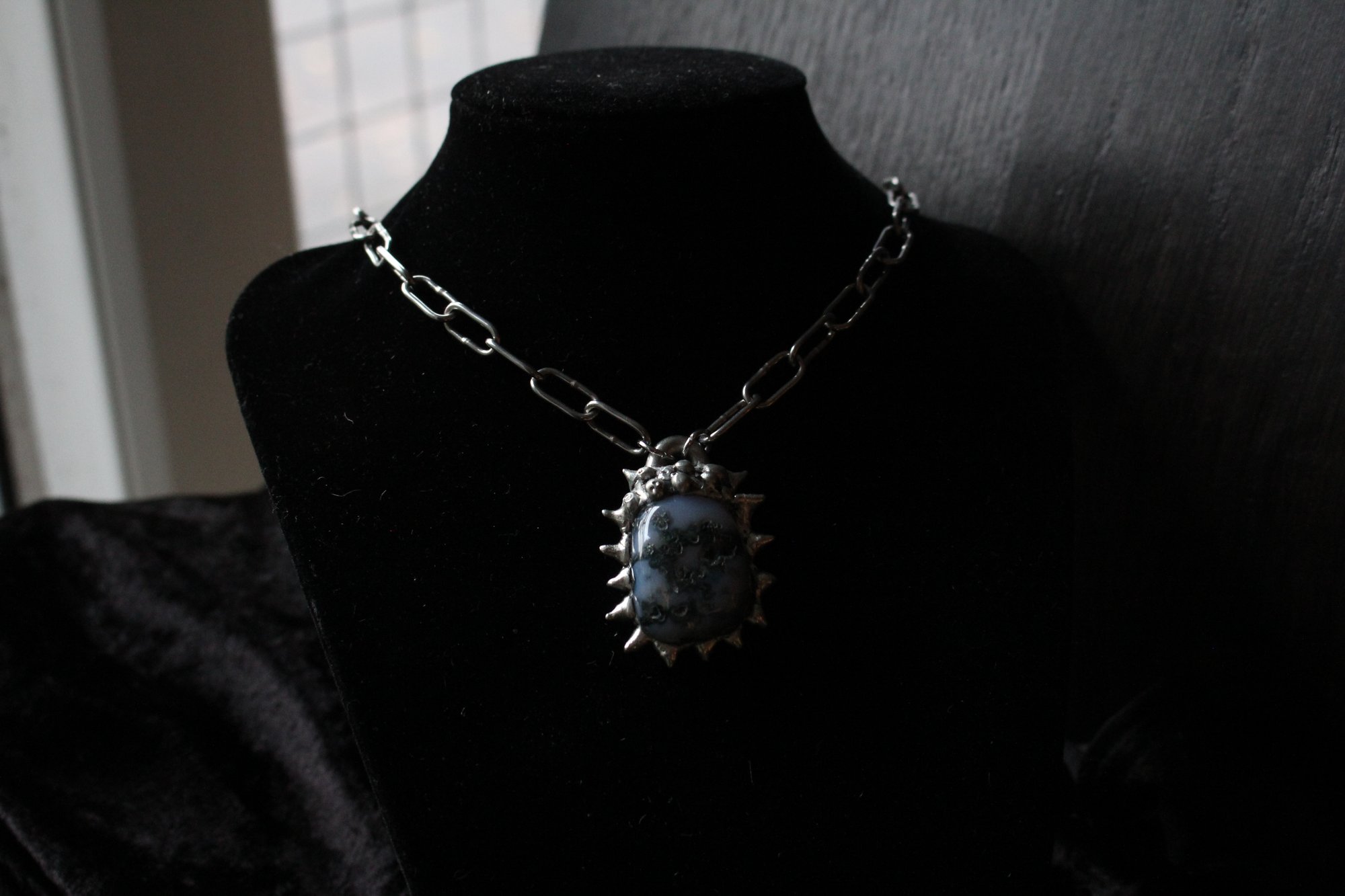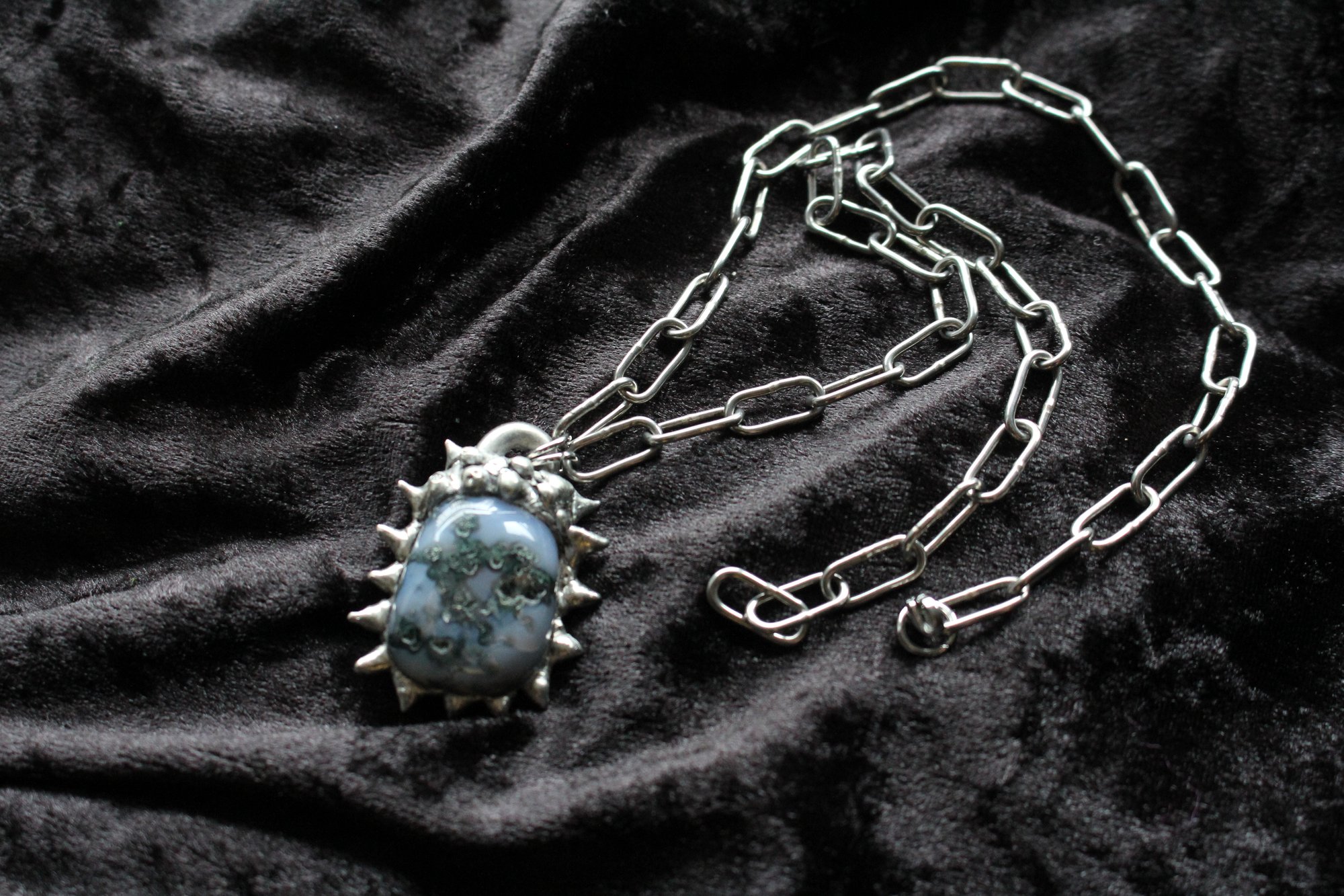 Moss agate featuring silver based spikes around the edge, on a 20 inches steel chain.
