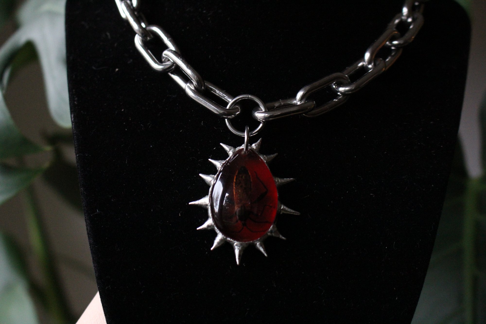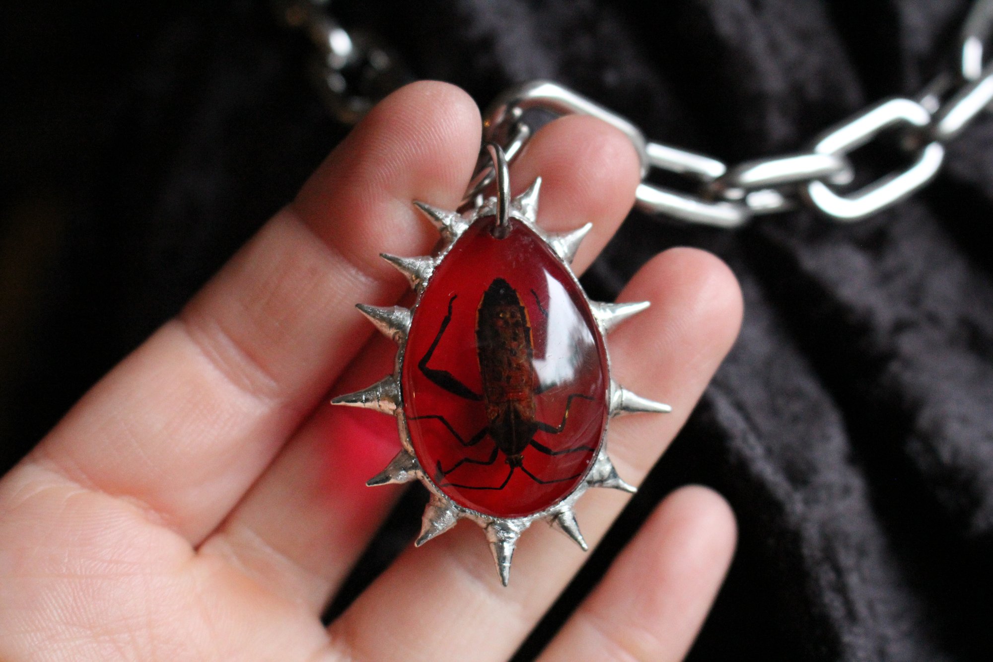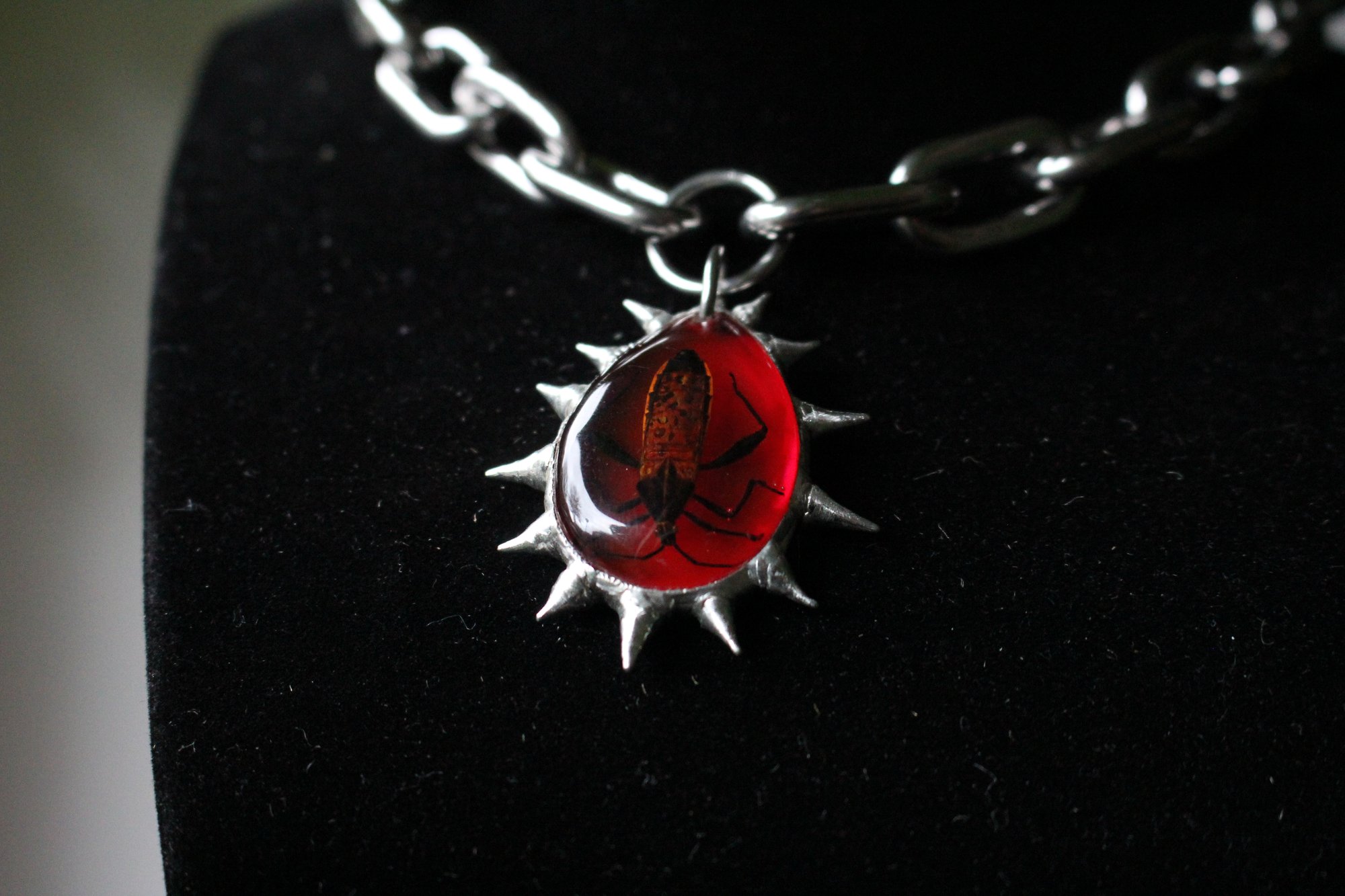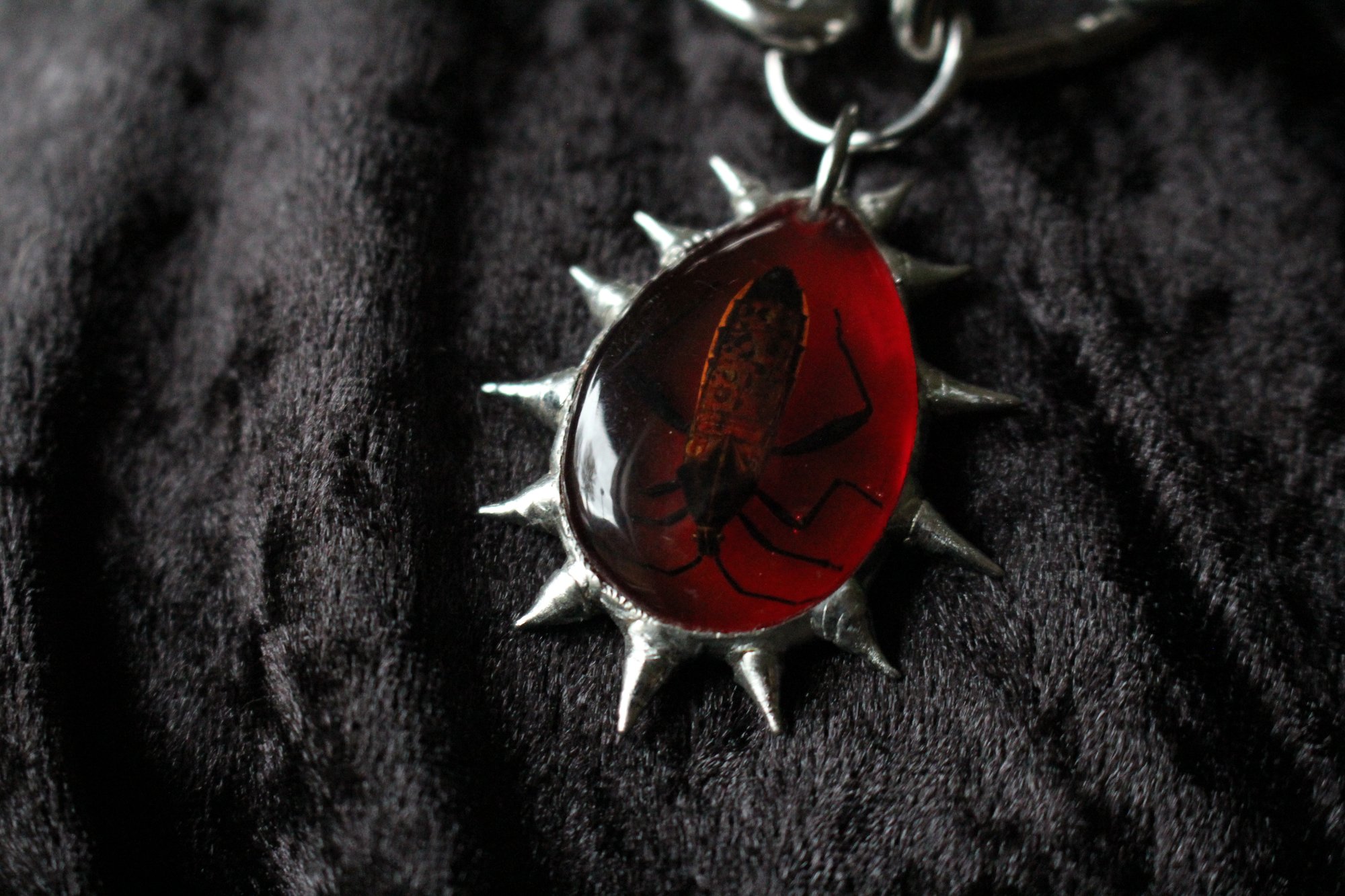 I found this resin insect keyring in a charity shop and decided to transform it into a necklace . I believe it to be a toe biter insect as per google lens. The stainless steel chunky chain comes included and measures 17''.