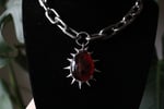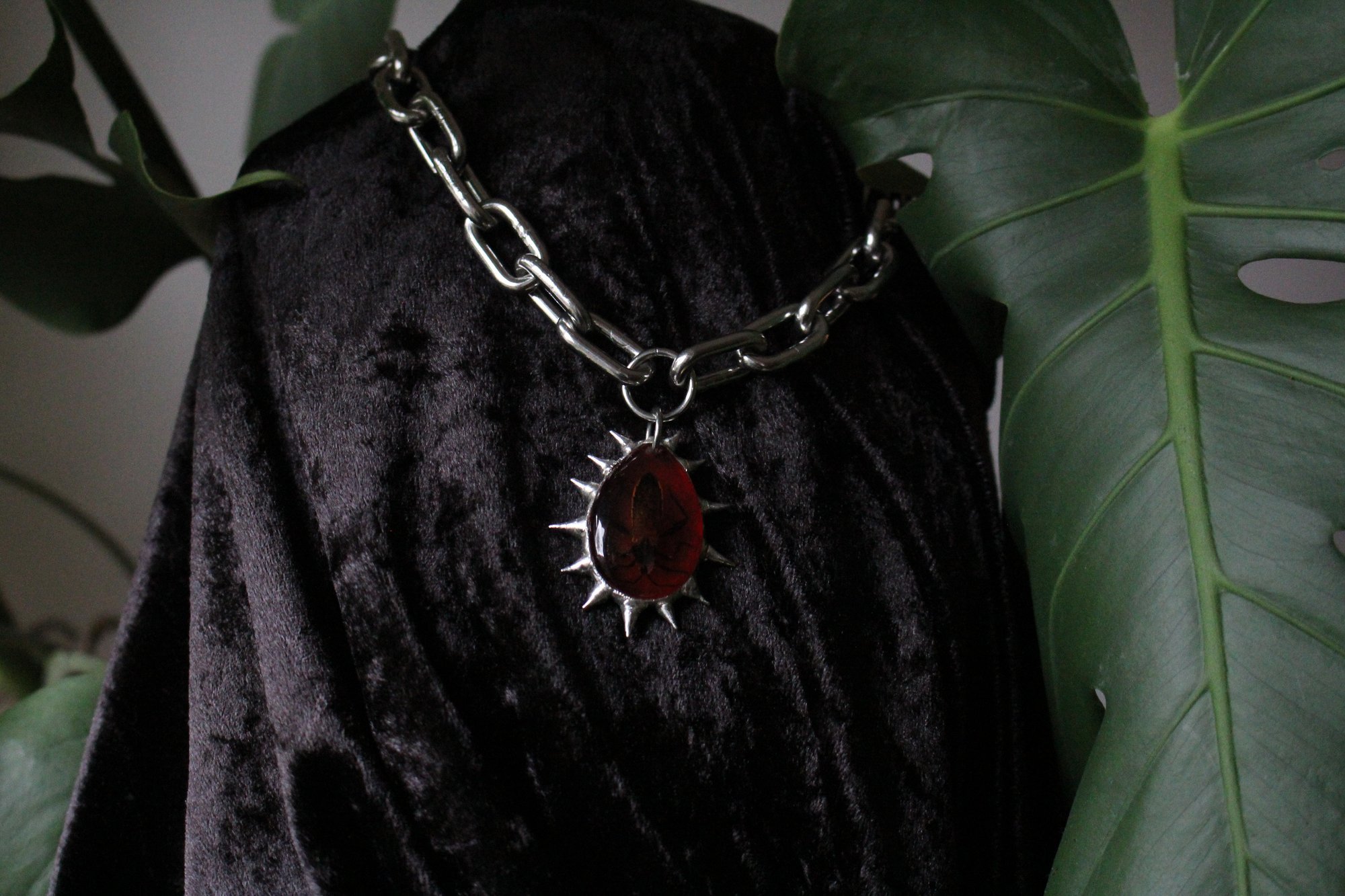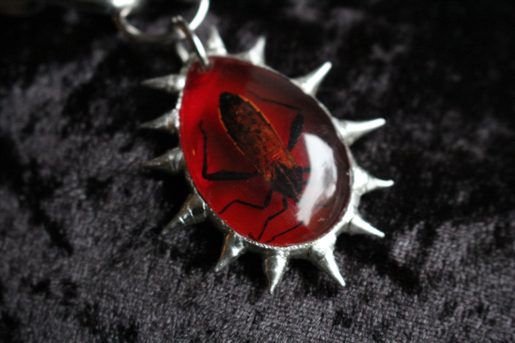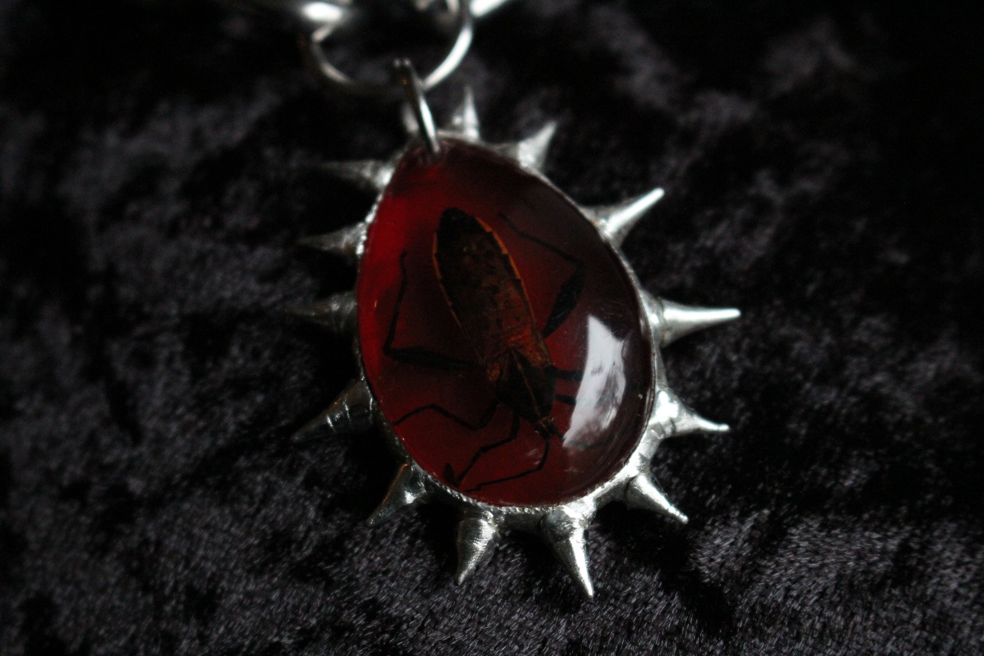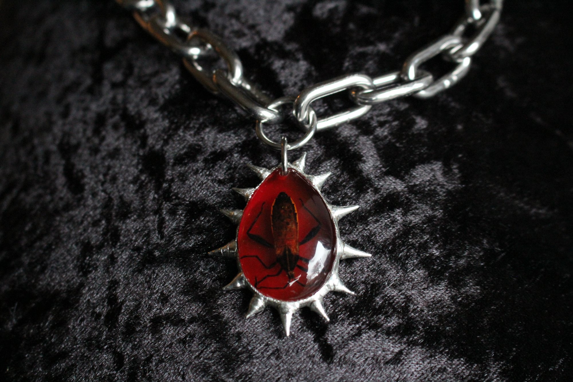 I found this resin insect keyring in a charity shop and decided to transform it into a necklace . I believe it to be a toe biter insect as per google lens. The stainless steel chunky chain comes included and measures 17''.