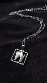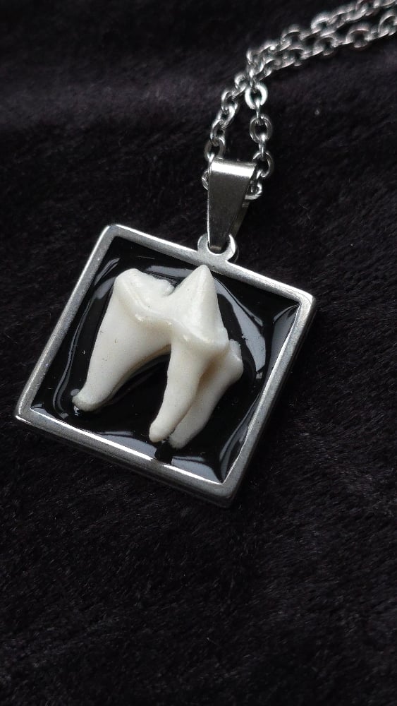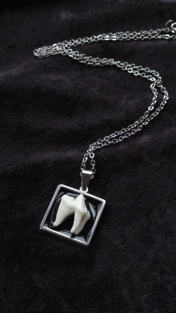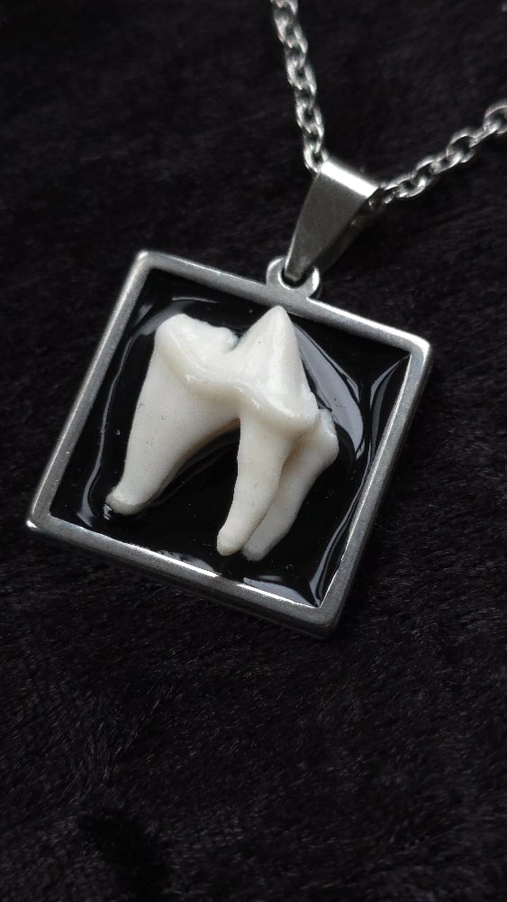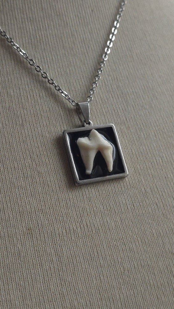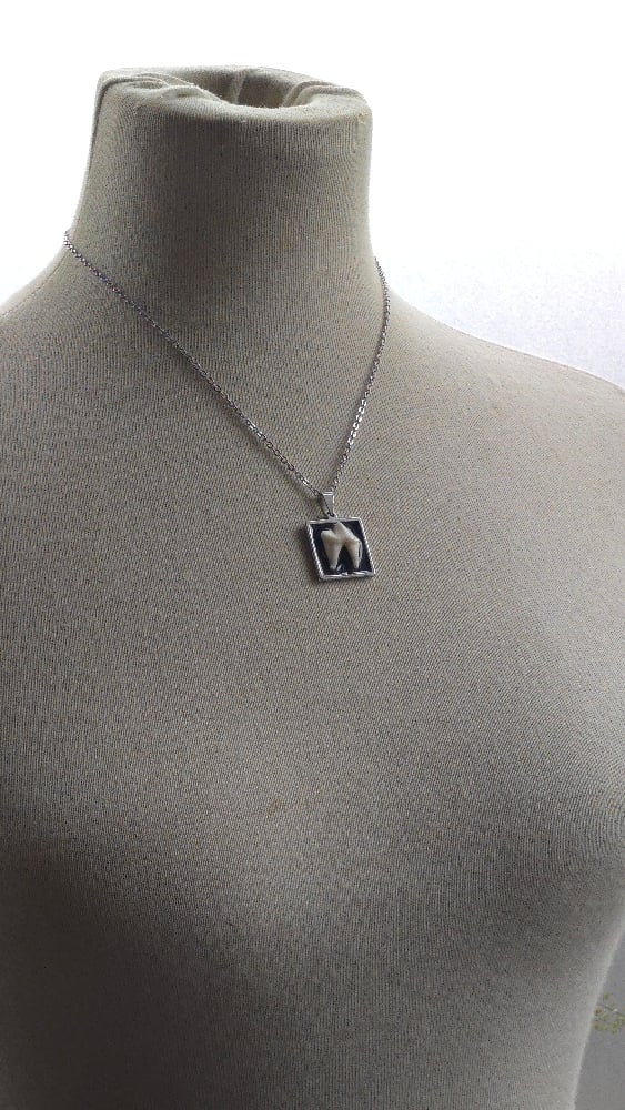 Foraged fox tooth on square steel bezel with 18" steel chain