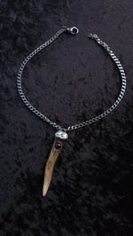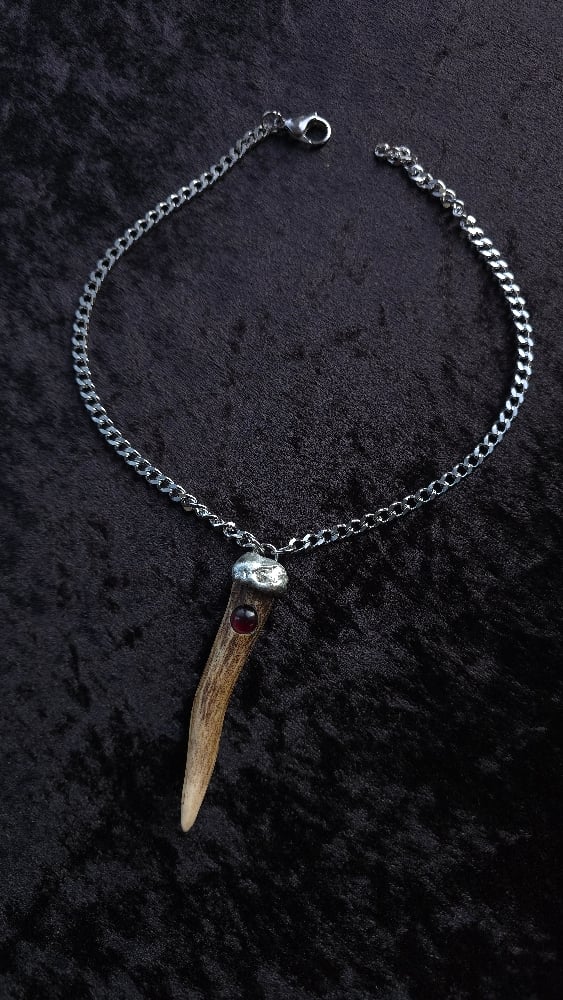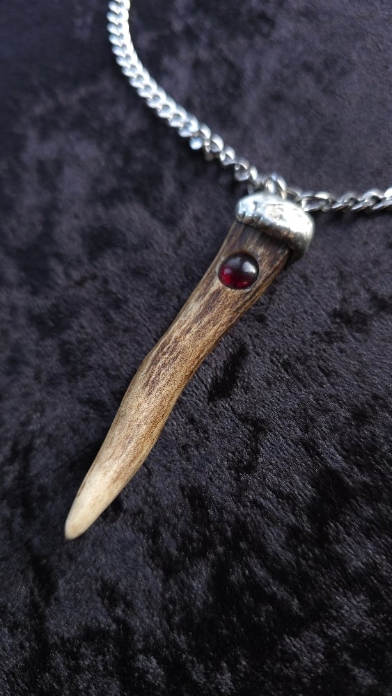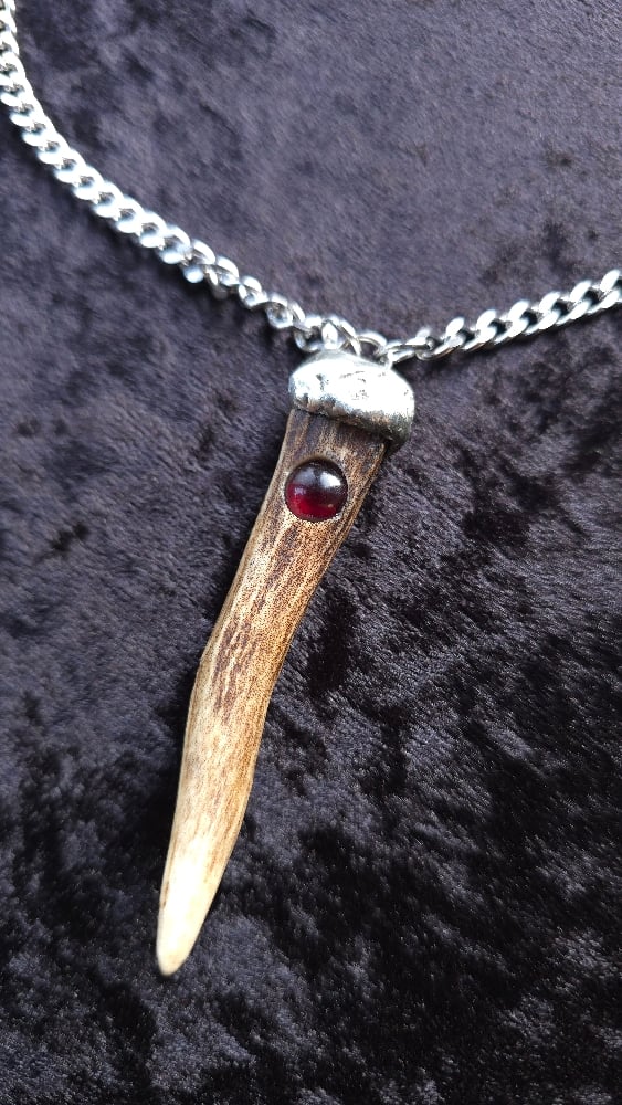 I live near a huge 8 mile wide forest and in that forest live lots of deer and their antlers naturally shed every year. This necklace is made from one of those antlers which i foraged , cleaned, cut and installed a high quality garnet crystal. Comes supplied with a