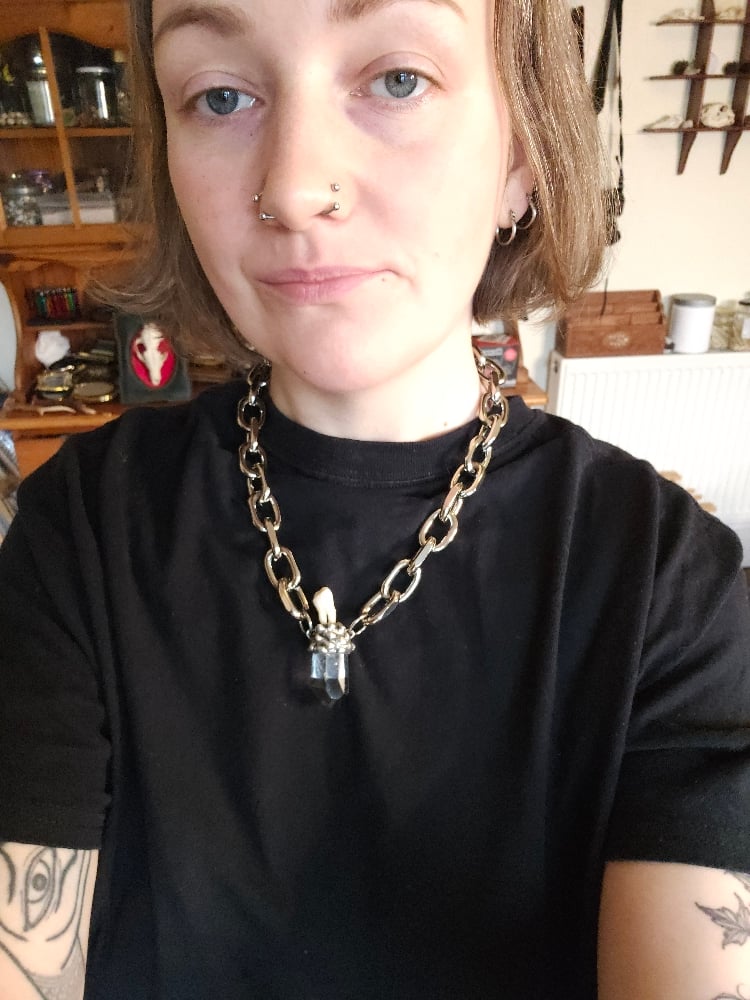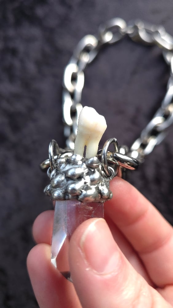 Real human tooth from an ex old medical study collection . A tooth once used for students to learn about dentistry is now transformed into a one of a kind pendant featuring a chunky quartz . The pendant part is soldered using lead free silver based solder. Comes supplied with a 21" alloy metal light and chunky chain .