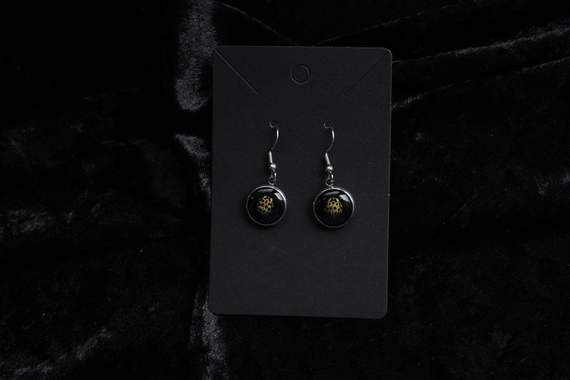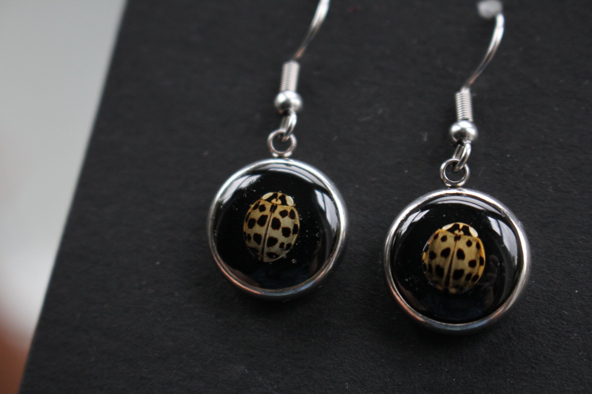 These earrings are made of hypoallergenic stainless steel. under the resin are naturally deceased ladybirds discovered in an attic of an antique shop, I was luckily able to collect the dead ladybirds to use in my art! so expect a lot of Ladybird jewellery as of 2025 🐞