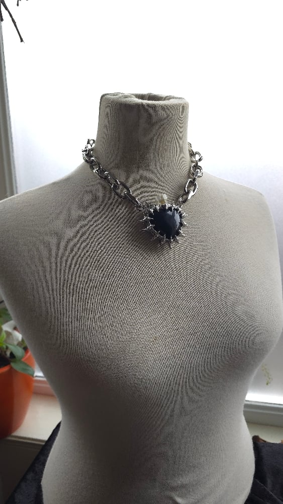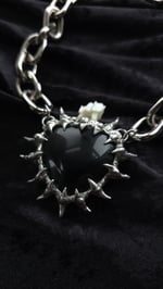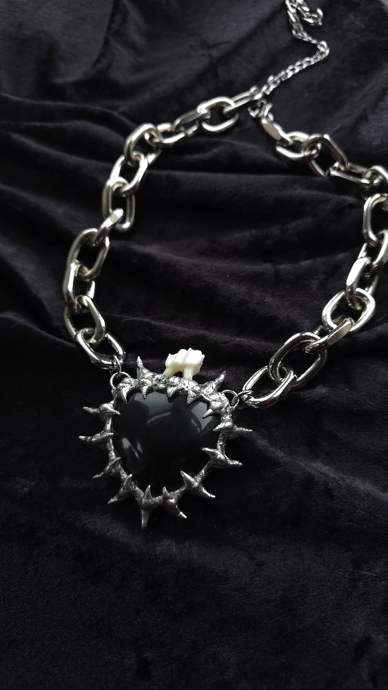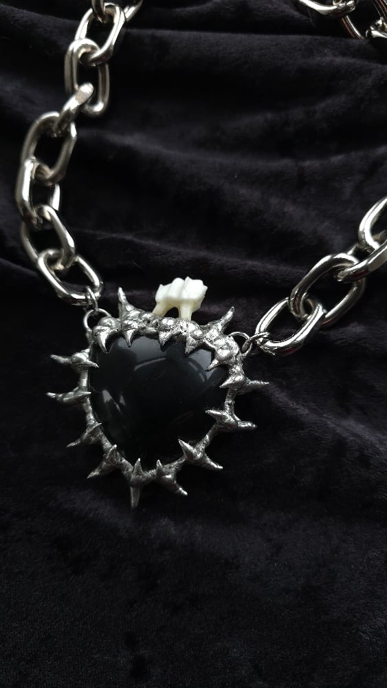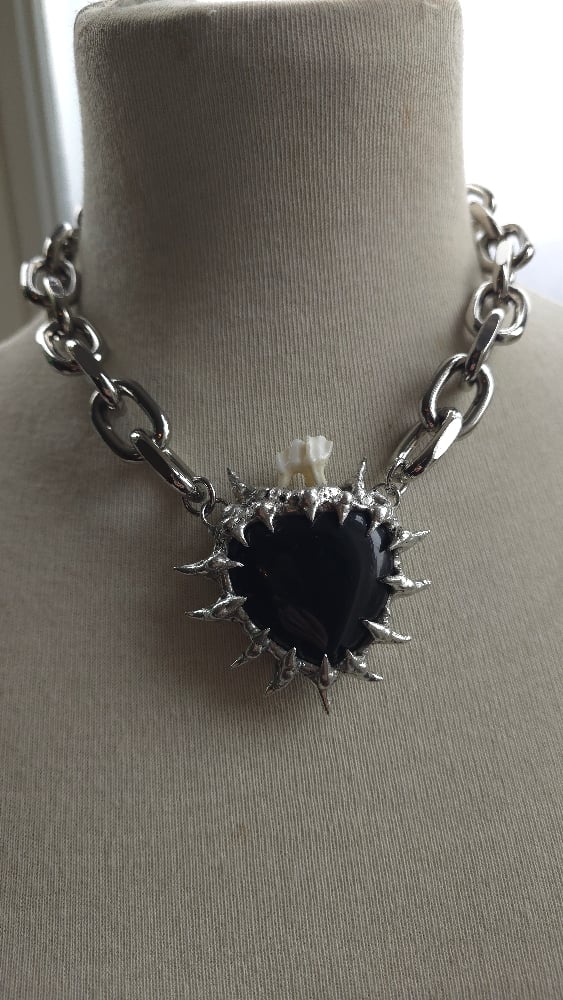 This badass necklace is composed of an obsidian heart with a deer tooth on top all soldered together with spikes!